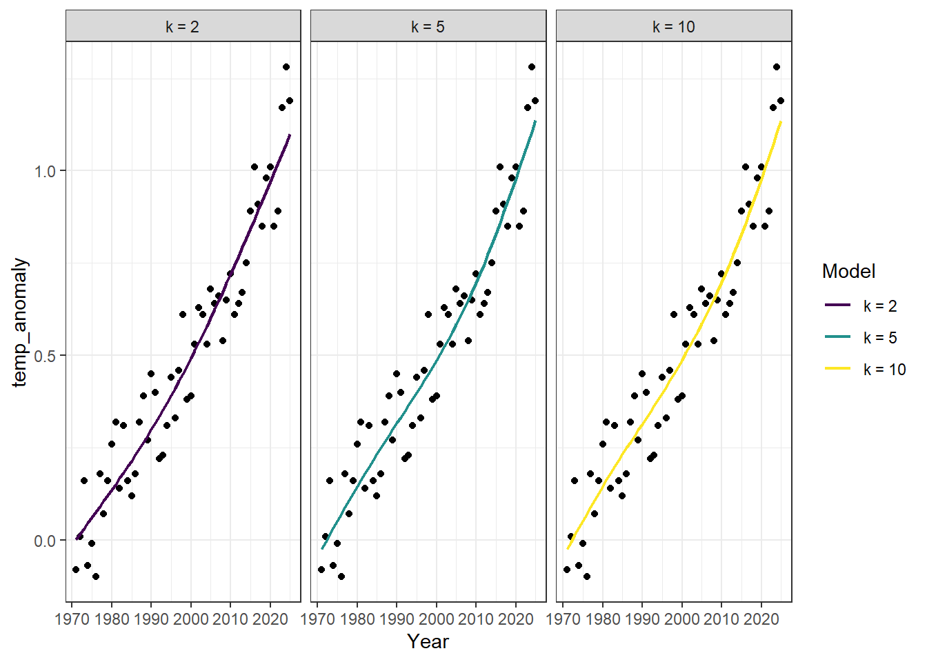 geom_line(data = preds, aes(x = year, y = temp, color = k), linewidth = 0.8) +