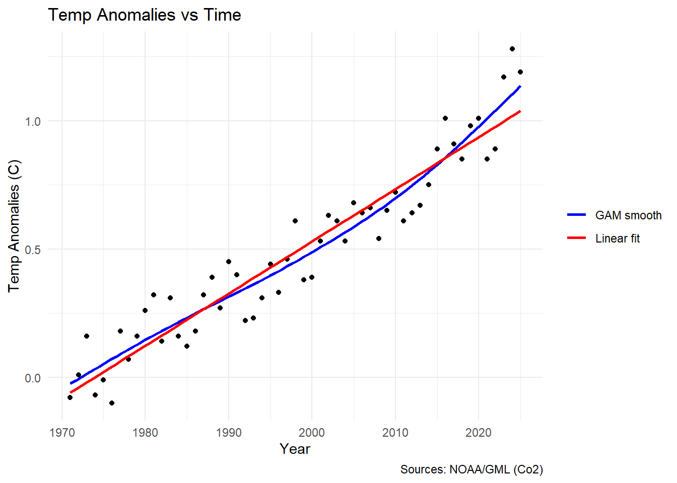 So looking at this, it might strike you that this doesn’t quite look like a linear relationship does it? So what is a researcher (tasked with the incredibly vague task of looking at temperature anomalies over time) to do upon seeing this 😂?! I’m glad you asked! Enter GAMs 🦸♀️!!