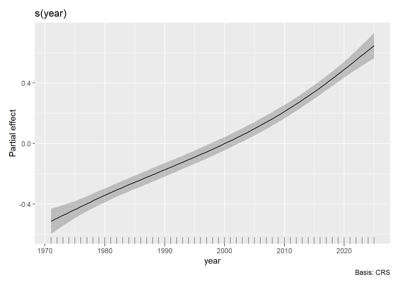 m <- gam(temp_anomaly ~ s(year, k = k, bs = "cr"), data = climate_data, method = "REML")