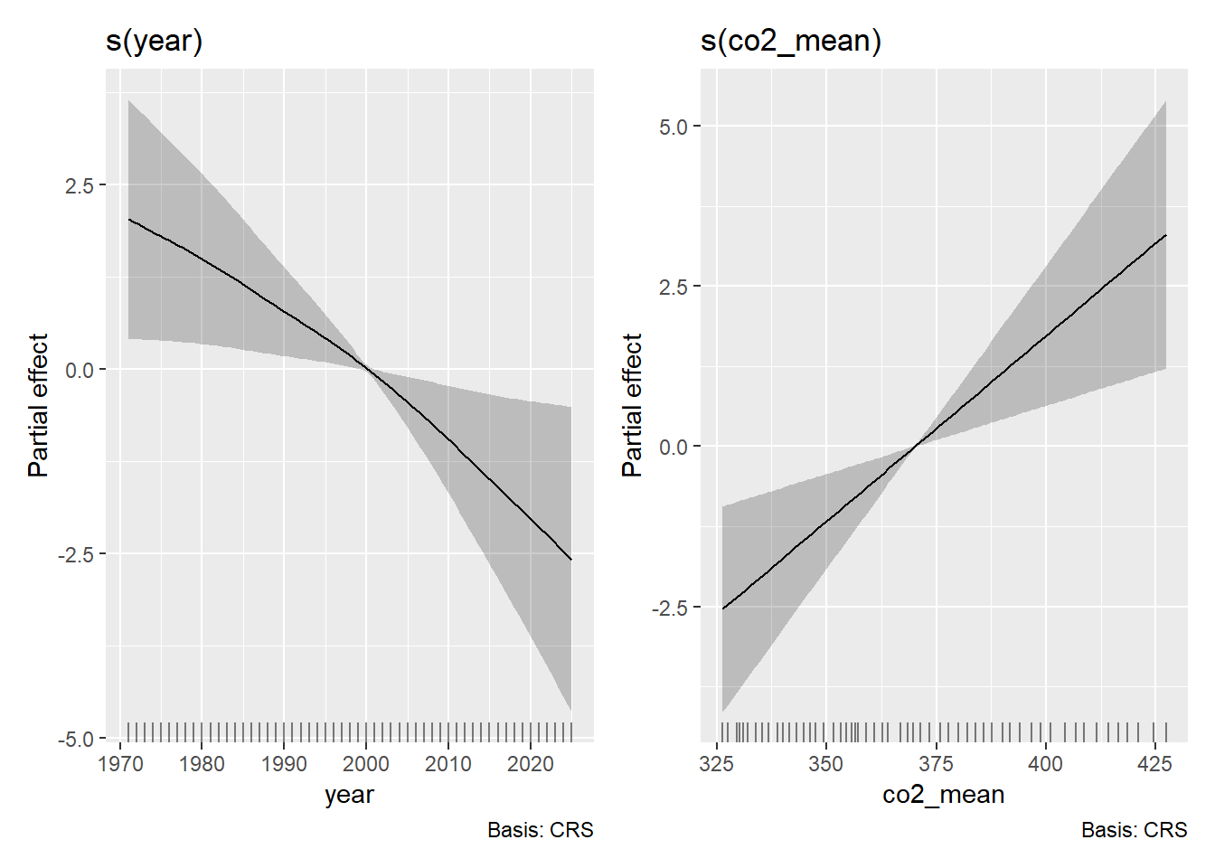Notice that we get two side-by-side plots (one per smoothed term)…but these plots no longer seem so sensible. In fact, let’s check to see that this is the case by running a model with co2_mean and temp_anomaly.