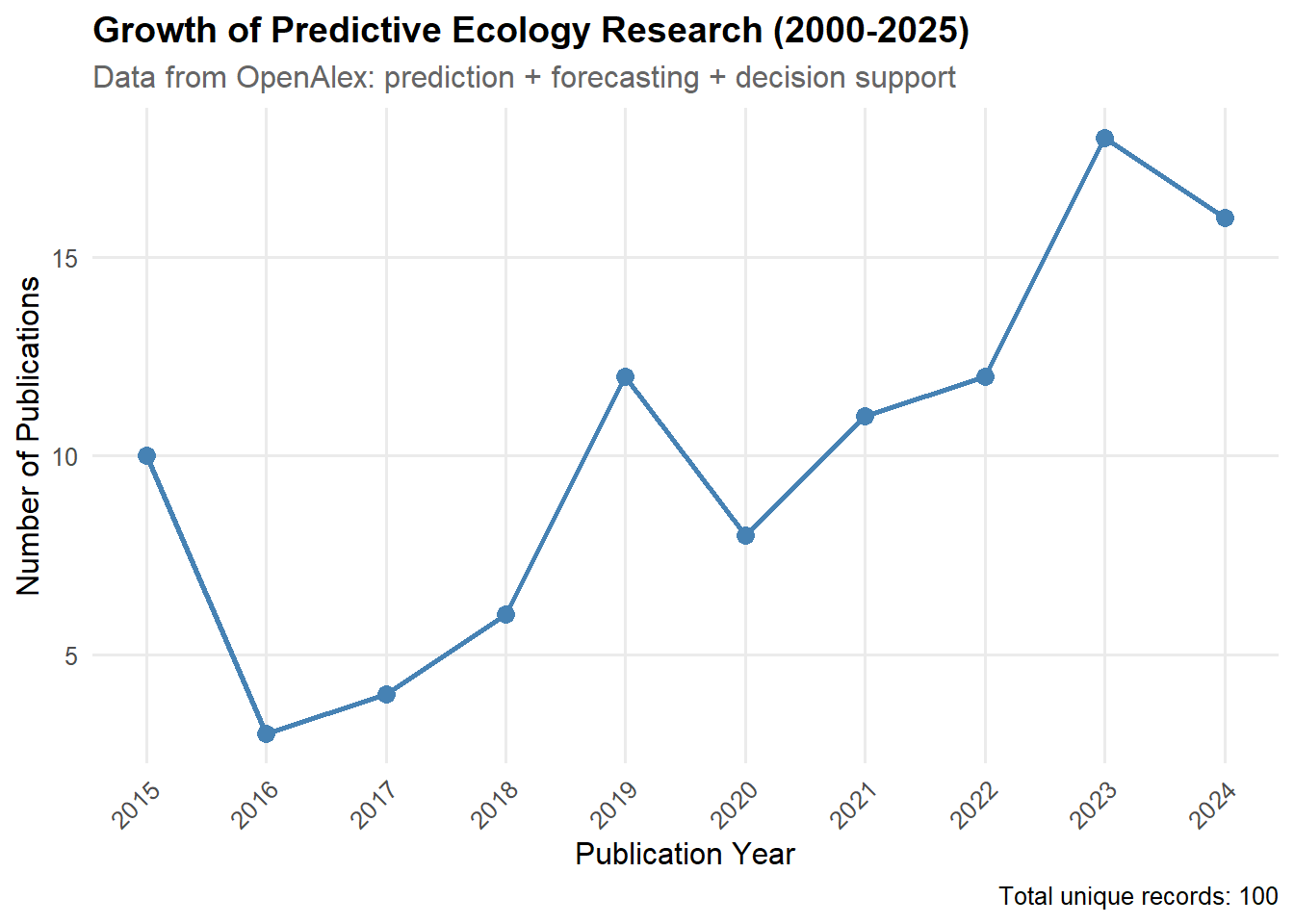 So great! We've done it. We've created a cool chart showing how important orecasting and decision support are becoming in Ecology with just a few lines of code. How about that to knock the socks off your advisor for your research proposal 🐱.